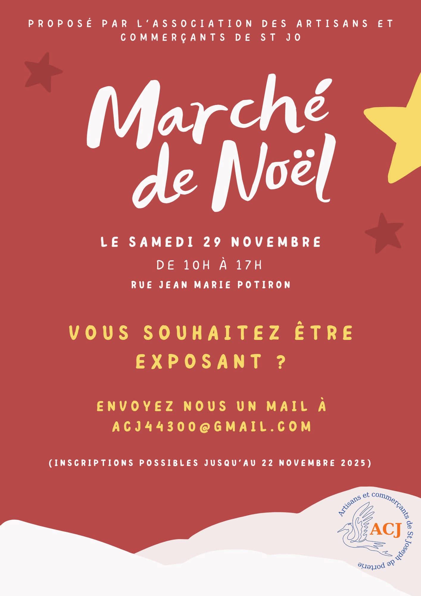 LâAssociation des Artisans et Commerçants de Saint-Jo (ACJ) prĂ©pare activement son traditionnel MarchĂ© de NoĂ«l, qui se tiendra le samedi 29 novembre 2025, de 10h Ă 17h, rue Jean-Marie Potiron Ă Saint-Joseph de Porterie.